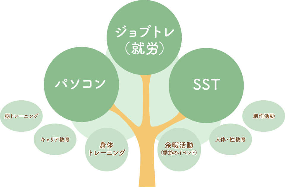 3つの柱は、「SST」「ジョブトレーニング」「パソコン」プログラム!