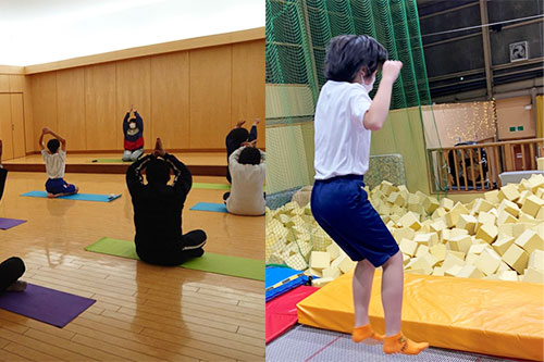 「おつかれストレッチ」「ヨガ」「バランスボール」「太極拳」「トランポリン」など 人生をしなやかに生きていく体づくりを目指して、みんなで一緒に体を動かしています。 体を動かす子どもたちの笑顔が見られます。